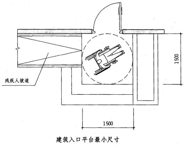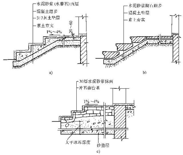 3、平台:连接出入口与踏步之间部分,起缓冲作用。深度一般不小于1000mm,平台表面宜比室内地面低20mm,并向外找坡1% ~3%。